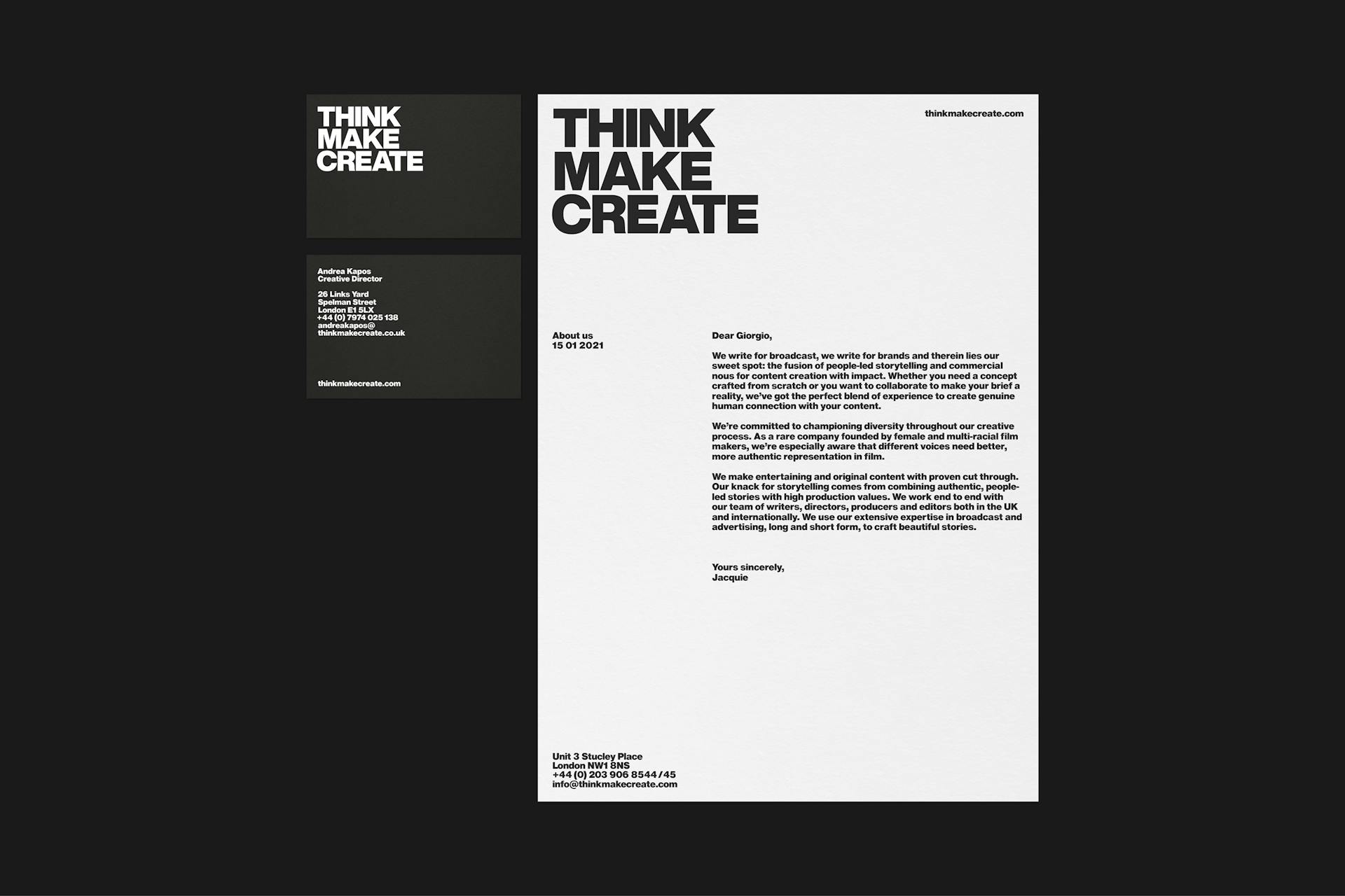 Content production is a highly competitive field. So, when Think Make Create requested a new visual ID, our first step was to look at what sets them apart. The production house creates cut-through content by combining authentic, people-led storytelling with high production values. Picking up on this distinctive aspect of TMC’s offer, we took a bold, disciplined typographic approach, putting emphasis squarely on directness, clarity and impact.